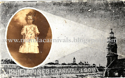 A 1908 souvenir photo of a young carnival visitor by the name of Mary Helen. The dedication at the back reads: "Mary Helen and I attended the Carnival last evening. Be well. Albert.". It is addressed to a certain Mris. Robeson of Seattle, Washington, postmartked 4 March 1908, from Manila. The oval picture of Mary Helen in sepia was taken separately then pasted on a window on the postcard, that features the famous light tower that lit the Carnival grounds. Photo studio booths made good business taking snaps of Carnival scenes and revelers, making for good souvenirs of the country's national fair.